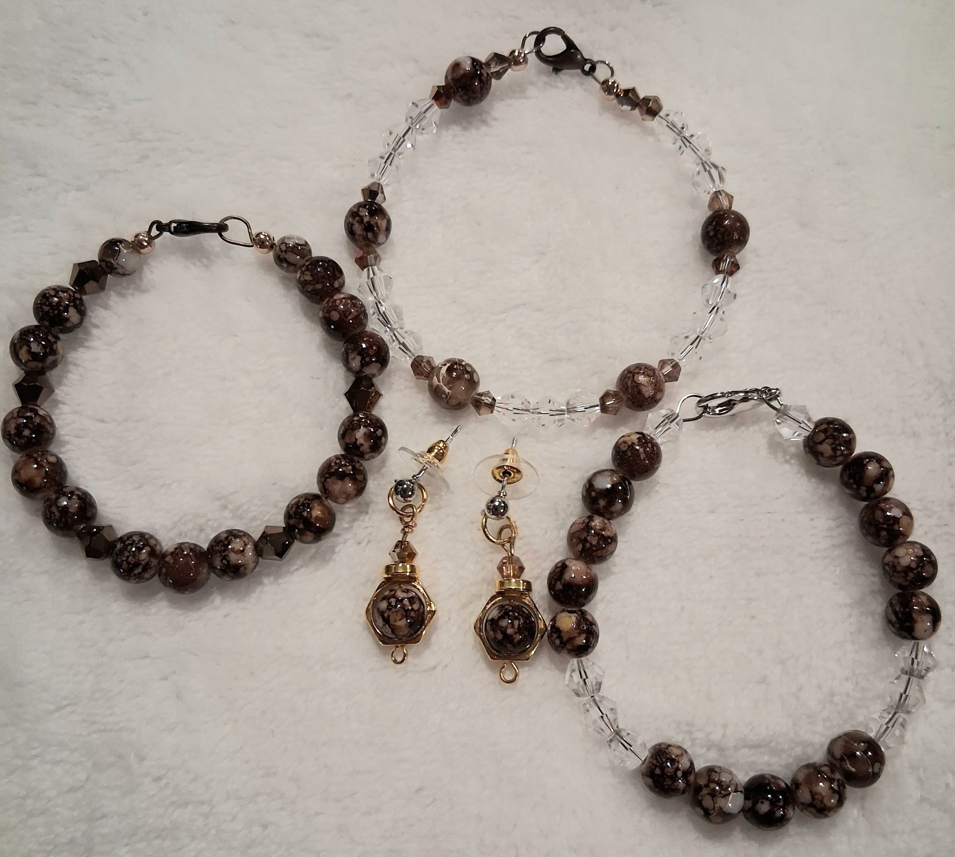 Add a touch of earthy sophistication to your style with this handcrafted jewelry set from Blessed Handcrafted Creations. This one-of-a-kind collection features a trio of memory wire bracelets and coordinating earrings, showcasing rich brown and black speckled gemstone-style beads paired with sparkling faceted crystal accents. Each piece is meticulously designed to blend natural warmth with a hint of glamor.