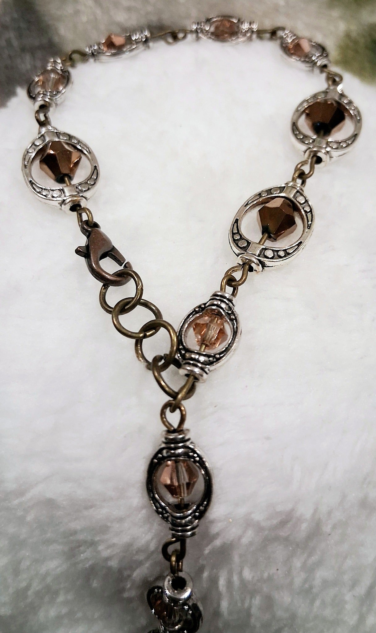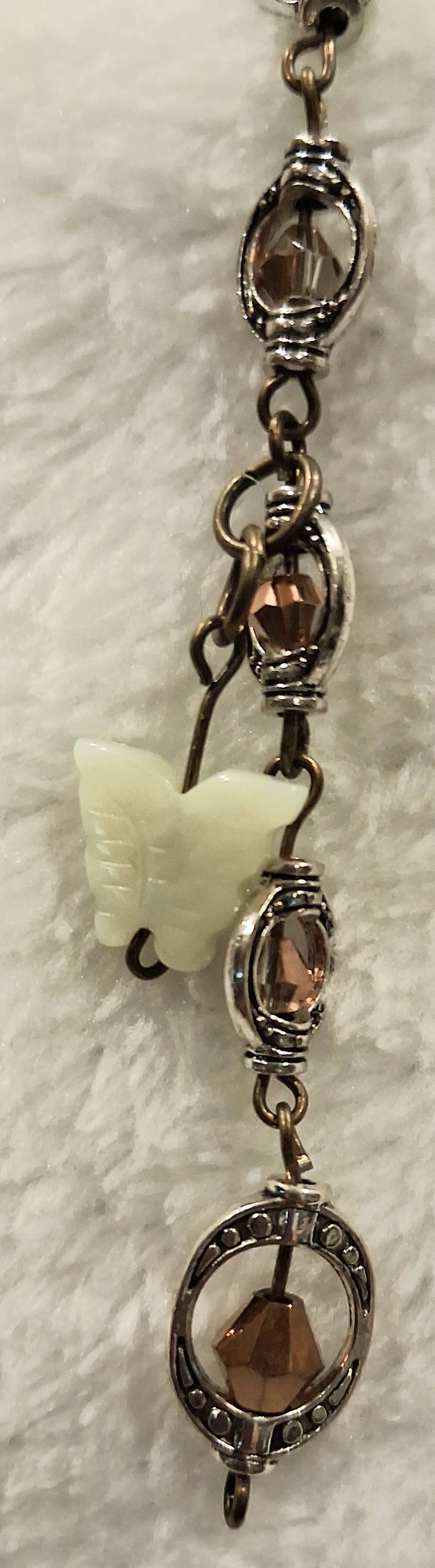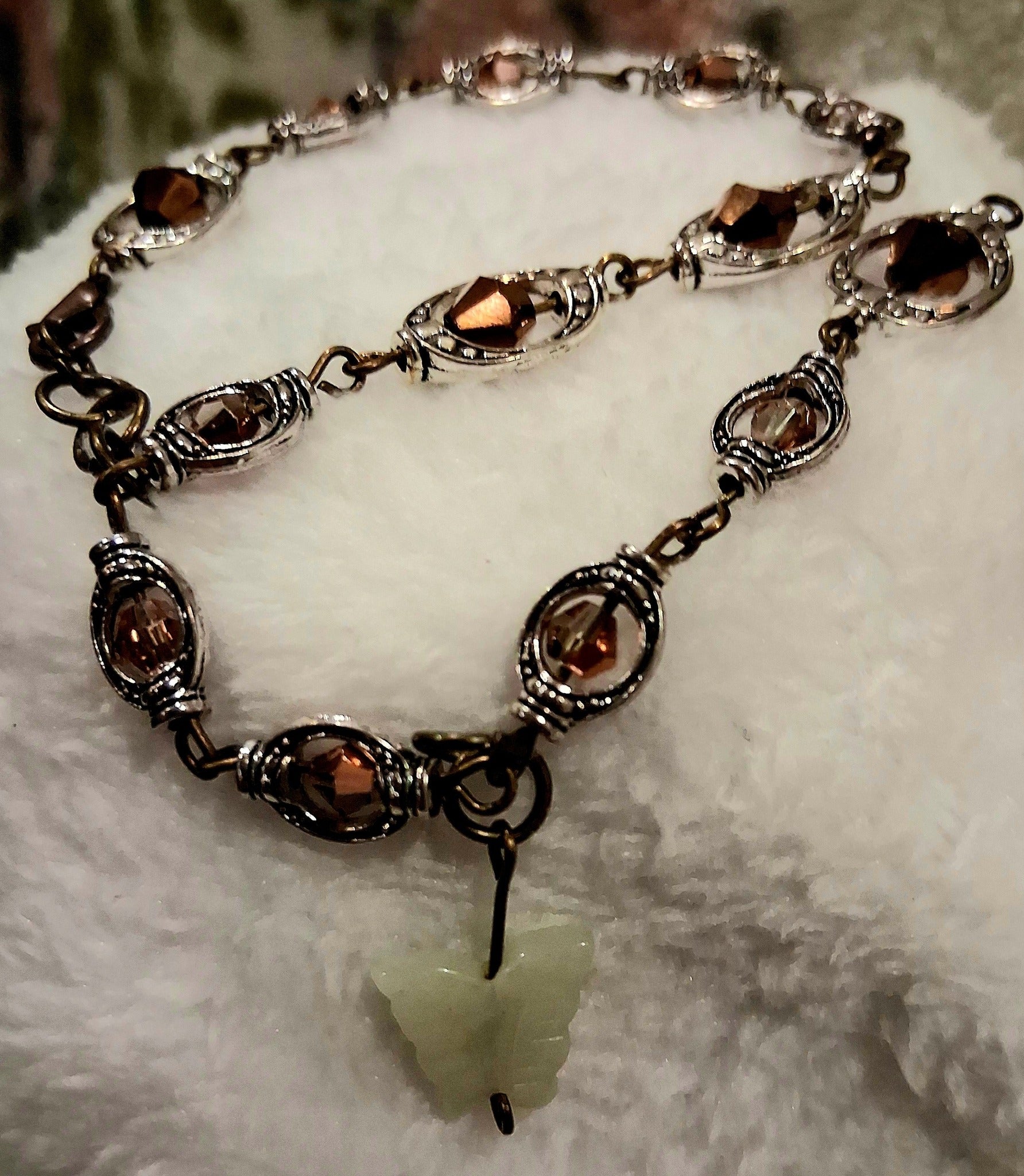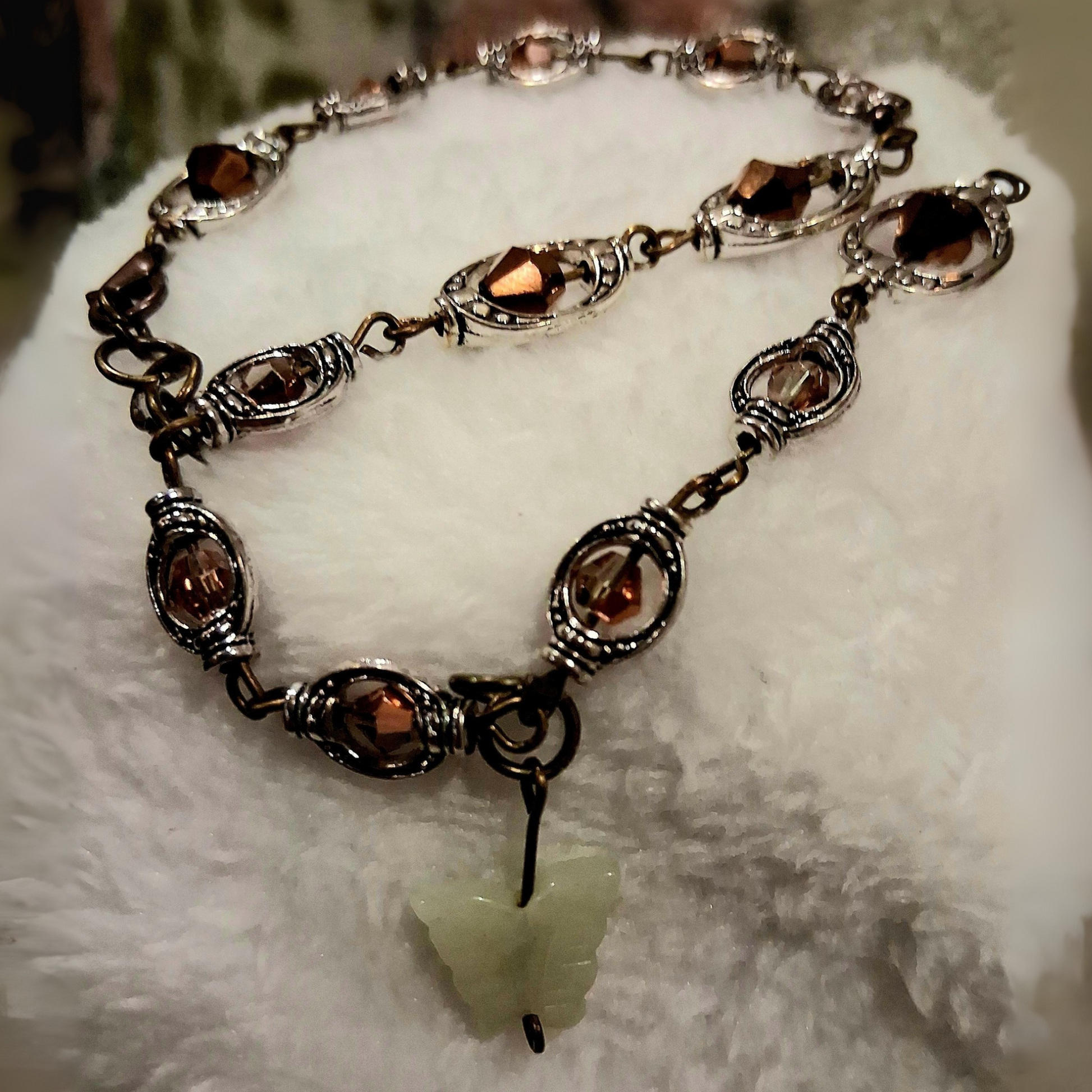 Embrace a blend of vintage charm and natural beauty with the Vintage Serenity Necklace from Blessed Handcrafted Creations. This unique handmade piece features faceted bronze crystal rondelles encased in ornate silver-tone wire-wrapped links. The soft green butterfly pendant gently dangles from the center, symbolizing peace, transformation, and grace.