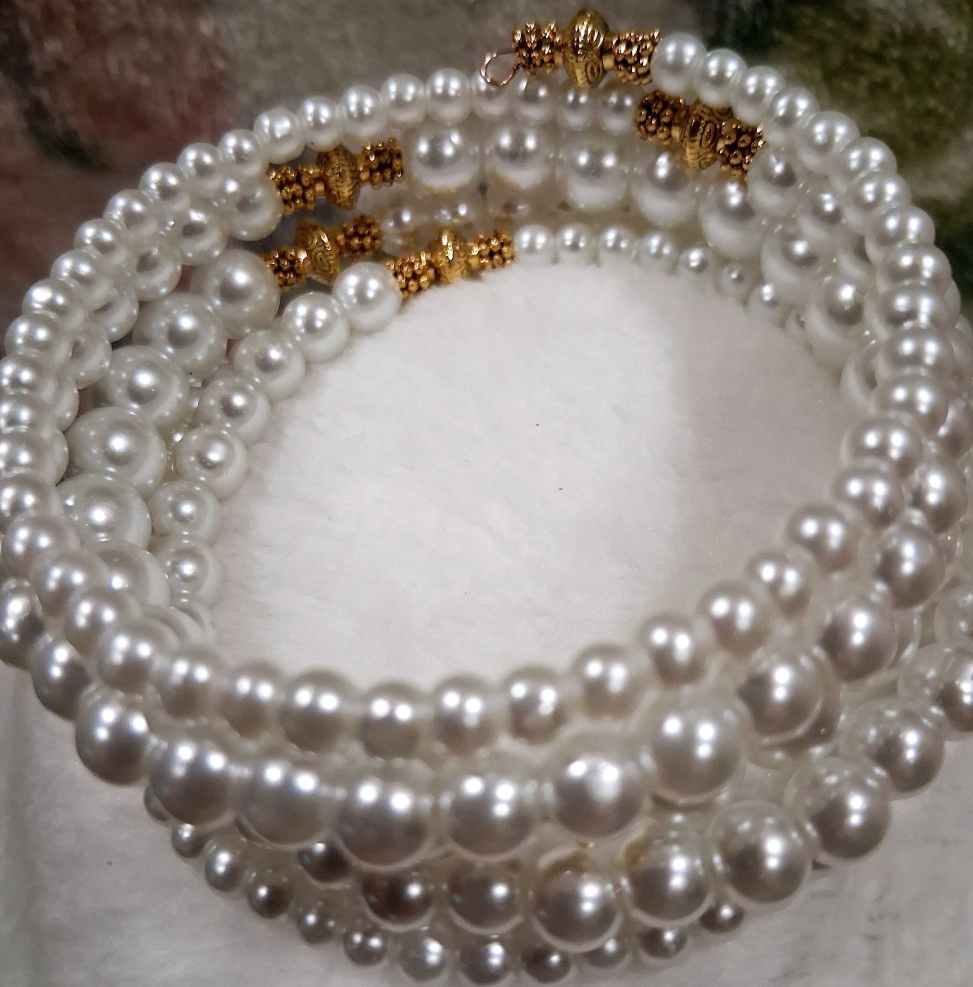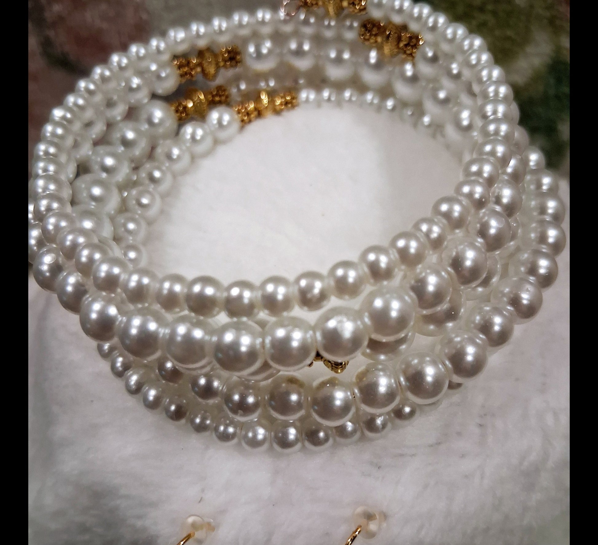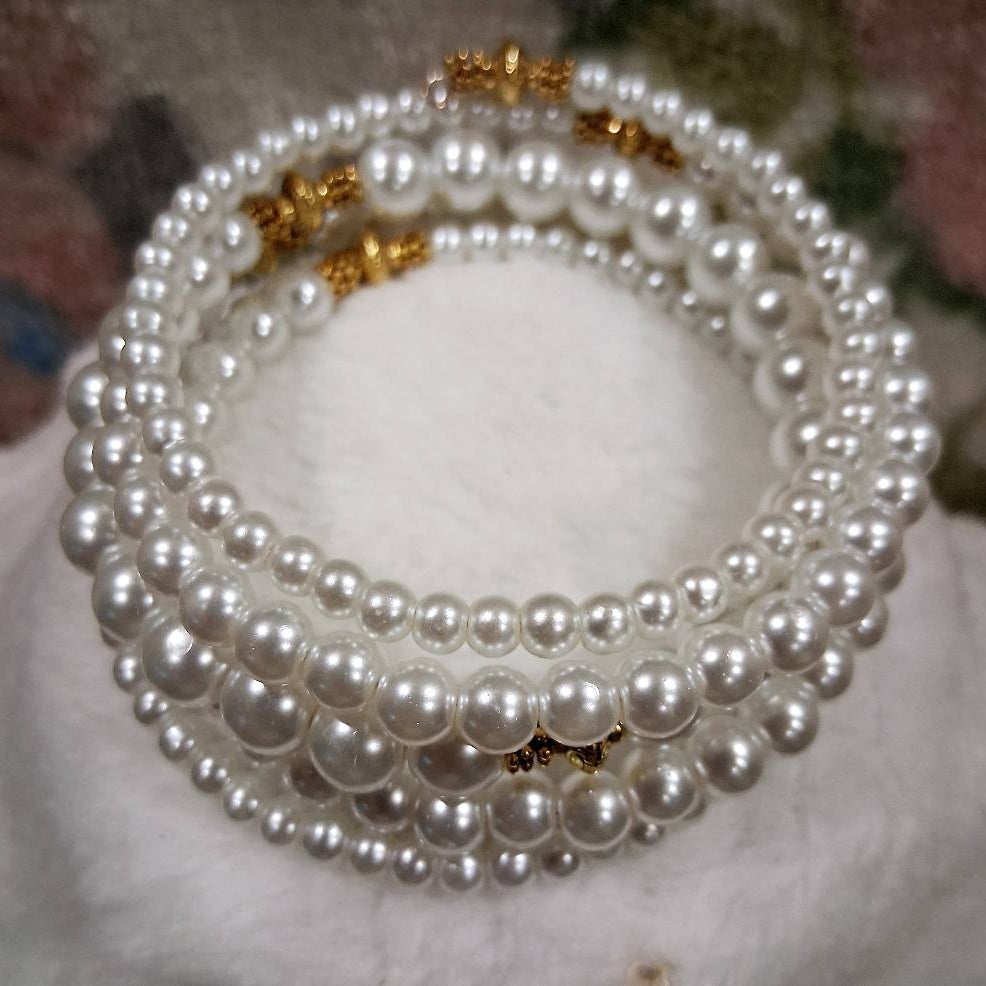 Elevate your look with the classic beauty of the Timeless Grace Bracelet by Blessed Handcrafted Creations. This handcrafted memory wire bracelet features lustrous white glass pearls in graduated sizes, beautifully accented with gold-tone details. The wrap-around style offers a secure, comfortable fit without the need for a clasp, making it a timeless and easy-to-wear accessory for any occasion.