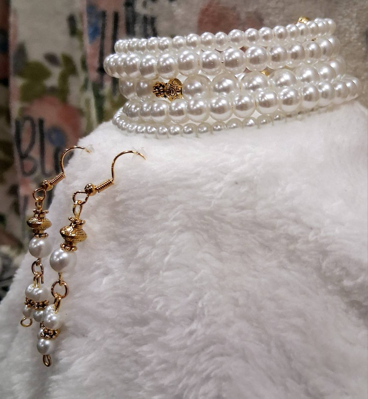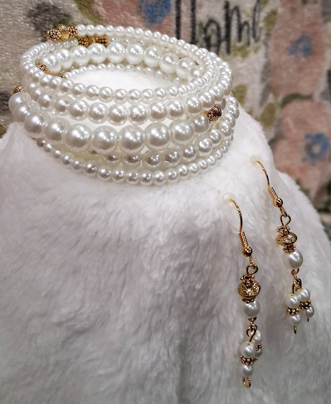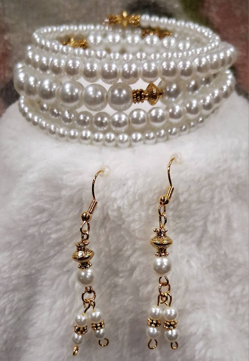 Elevate your look with the classic beauty of the Timeless Grace Bracelet by Blessed Handcrafted Creations. This handcrafted memory wire bracelet features lustrous white glass pearls in graduated sizes, beautifully accented with gold-tone details. The wrap-around style offers a secure, comfortable fit without the need for a clasp, making it a timeless and easy-to-wear accessory for any occasion.