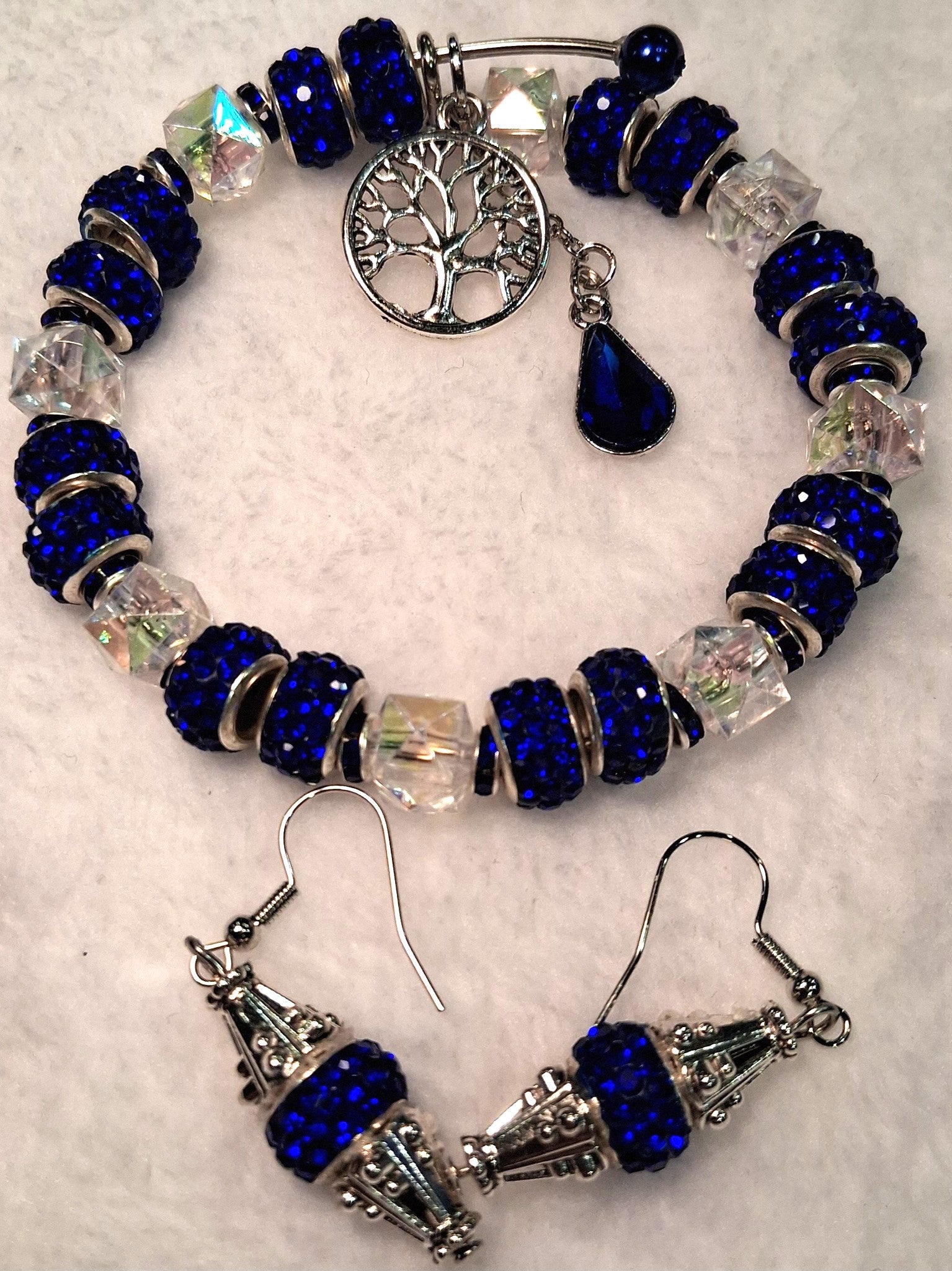 Elevate your look with this stunning Royal Radiance Jewelry Set from Blessed Handcrafted Creations. This handcrafted duo includes a sparkling adjustable bangle bracelet and matching earrings, featuring rich deep blue rhinestone rondelle beads accented with clear cube crystals and ornate silver findings.