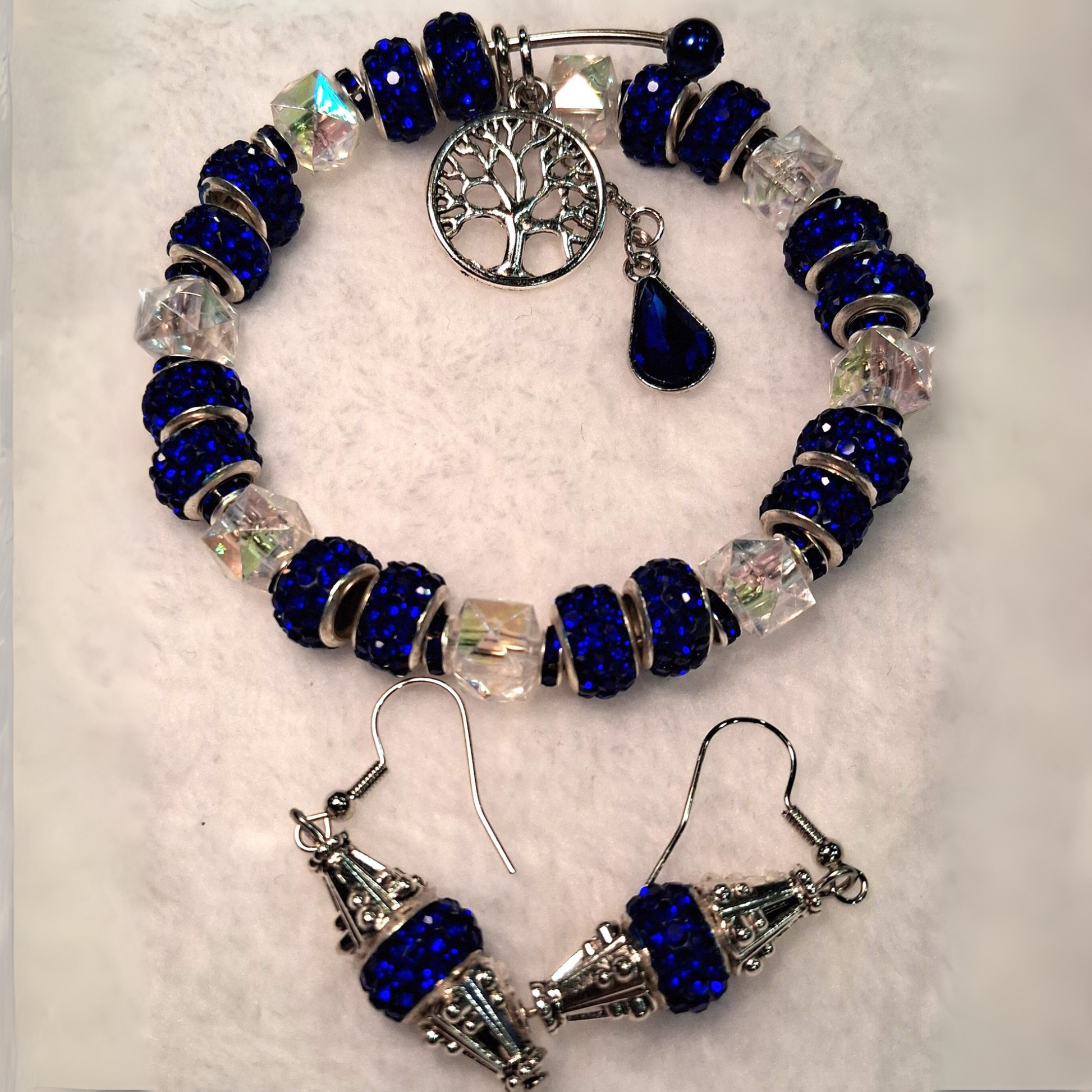 The bracelet is finished with a Tree of Life charm, symbolizing strength, growth, and connection, along with a deep sapphire glass teardrop charm for added elegance. Whether you’re dressing up for a night out or gifting something meaningful, this set brings beauty, symbolism, and shimmer together in one unforgettable design.
