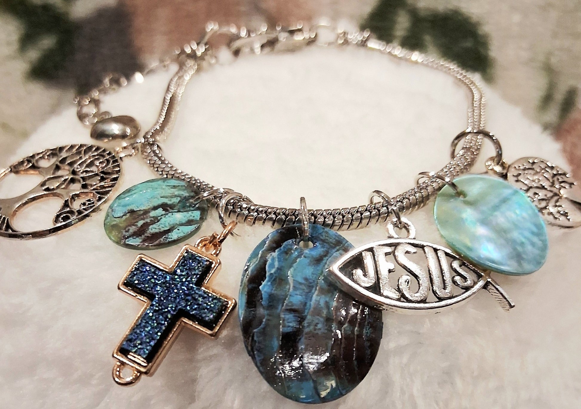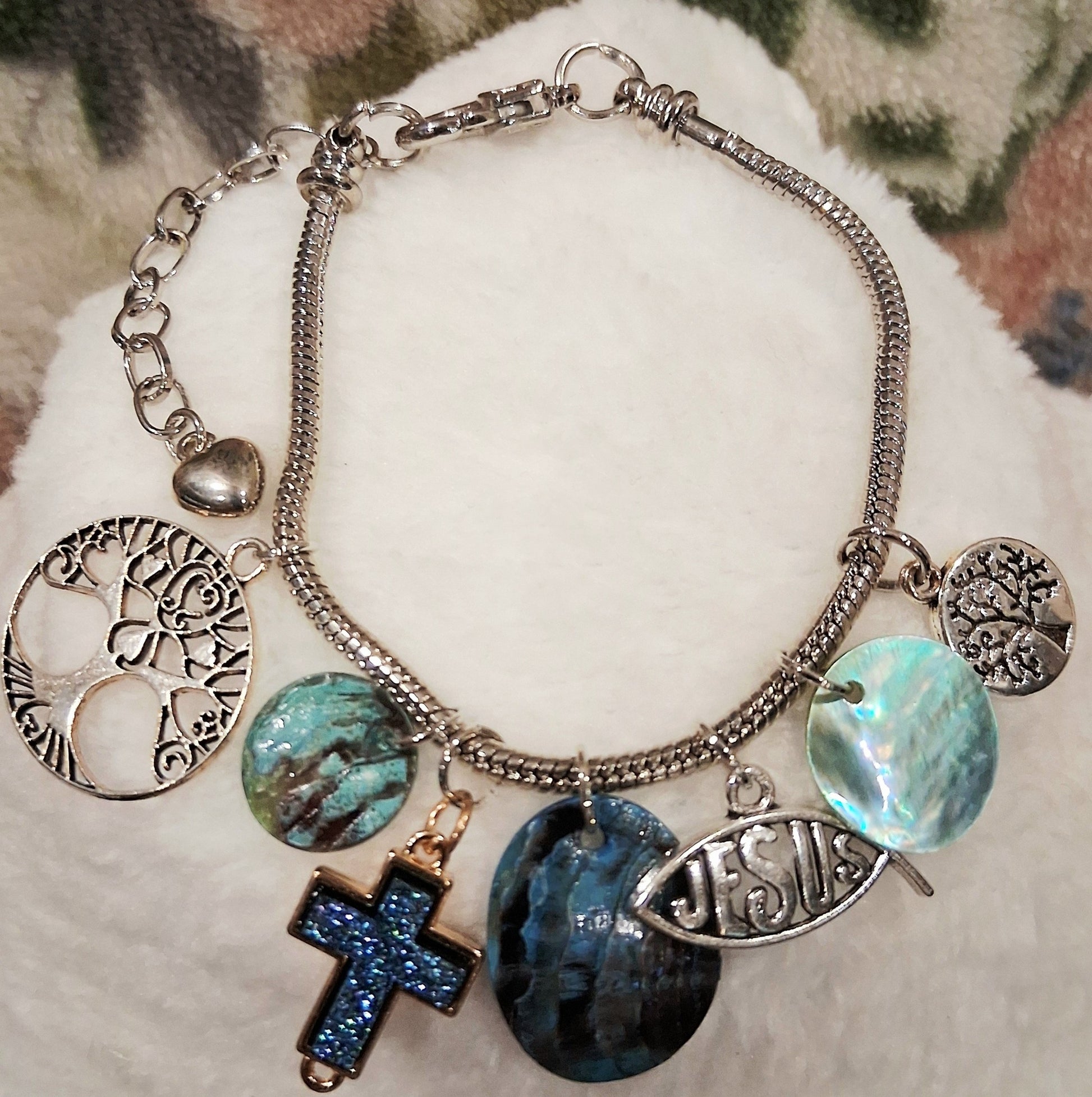 This handcrafted silver-tone charm bracelet by Blessed Handcrafted Creations is a beautiful expression of faith, love, and spiritual strength. Adorned with shimmering abalone-style shell discs, an elegant "Jesus" fish charm, a sparkling blue cross, Tree of Life charms, and a silver heart accent, this bracelet is both a meaningful statement and a stylish accessory.
