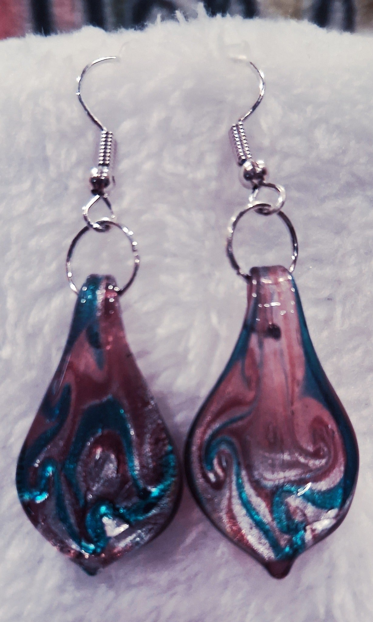Elevate your accessory game with these one-of-a-kind Teal & Maroon Swirl Glass Drop Earrings. Handcrafted with stunning detail, each earring features rich marbled swirls in shades of teal, maroon, and silvery pearl, encased in elegant teardrop-shaped glass. Lightweight and bold, they offer a pop of color and artisan charm that suits both casual wear and elegant occasions.